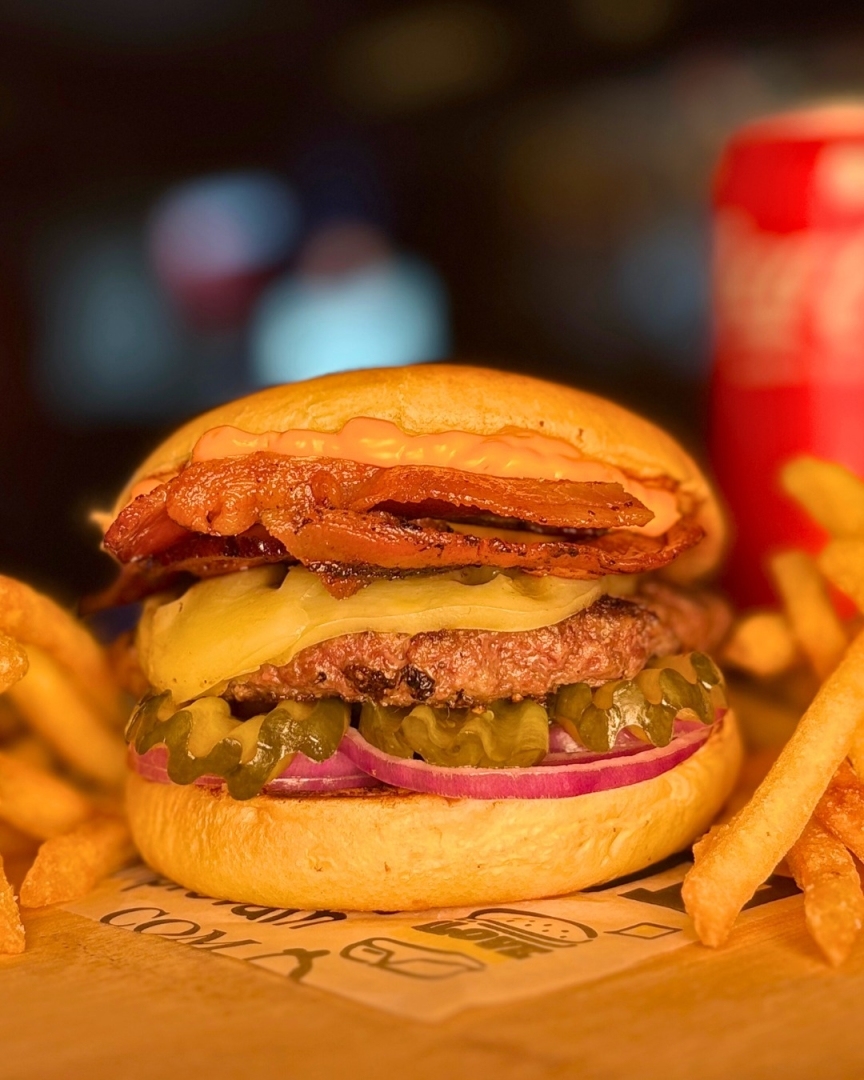 Descrição: Um hambúrguer robusto com duas camadas de carne de 120g, cheddar e bacon crocante, criando uma explosão de sabores clássicos. Ingredientes: Pão Brioche, Carne de 120g (2x), Cheddar, Bacon, Cebola Roxa, Barbecue