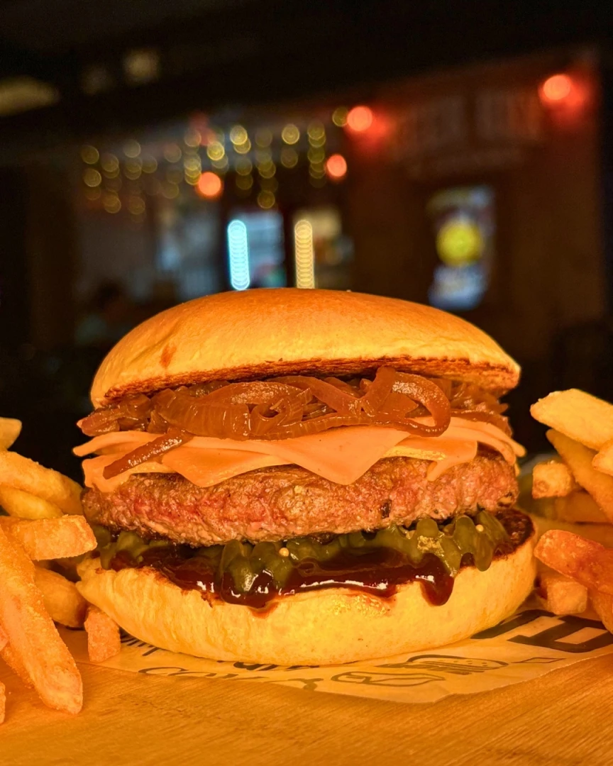 Descrição: Um hambúrguer robusto com duas camadas de carne de 120g, cheddar e bacon crocante, criando uma explosão de sabores clássicos. Ingredientes: Pão Brioche, Carne de 120g (2x), Cheddar, Bacon, Cebola Roxa, Barbecue